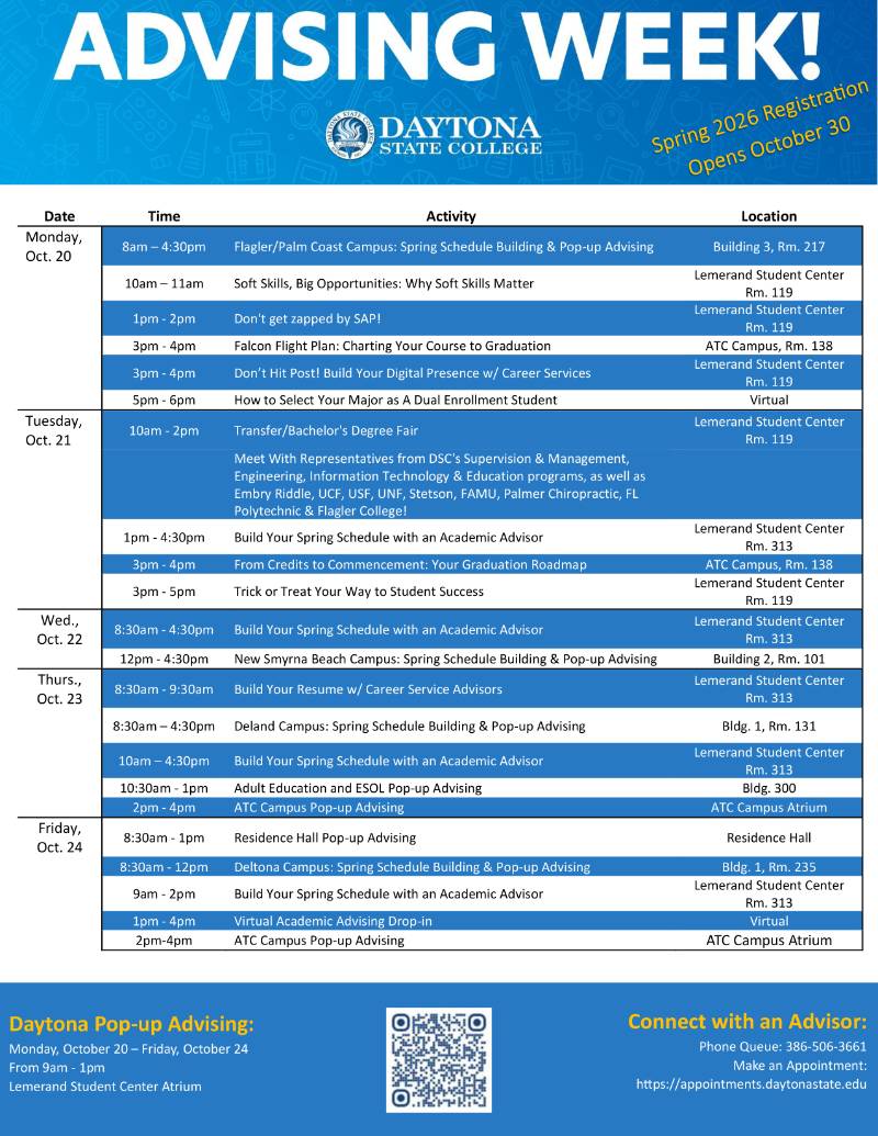 The mission of the Academic Advising Department at Daytona State College is part of a collaborative process designed to help students succeed academically by encouraging them to be proactive in planning their own education. Academic Advisors will assist students with developing an appropriate educational plan that will lead to graduation by providing them with timely and accurate information, making referrals to campus resources, and encouraging students to utilize these resources.
